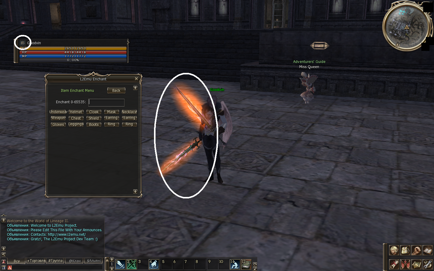 На сервере установлен полный ГМшоп, в том числе Intrlude, Kamael&Hellbond weapon&armor