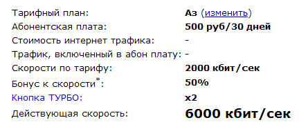 Вы можете в ночное время (с 0:00 до 8:00) увеличить скорость на Вашем тарифе в два раза нажав на кнопку «турбо». Акция действительна до 31 августа 2010 года.